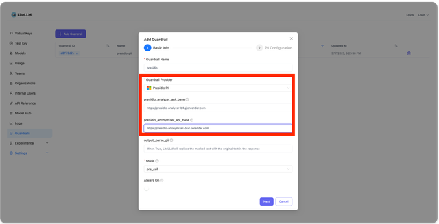 On the LiteLLM UI, navigate to Guardrails. Click "Add Guardrail". On this dropdown select "Presidio PII" and enter your presidio analyzer and anonymizer endpoints.