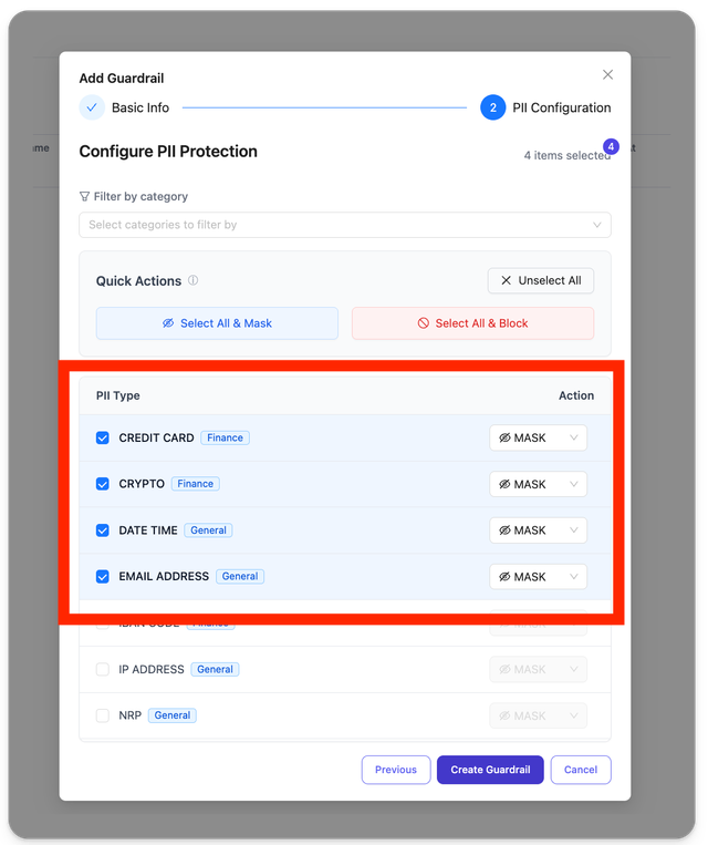 You can configure specific entity types for PII detection and decide how to handle each entity type (mask or block).