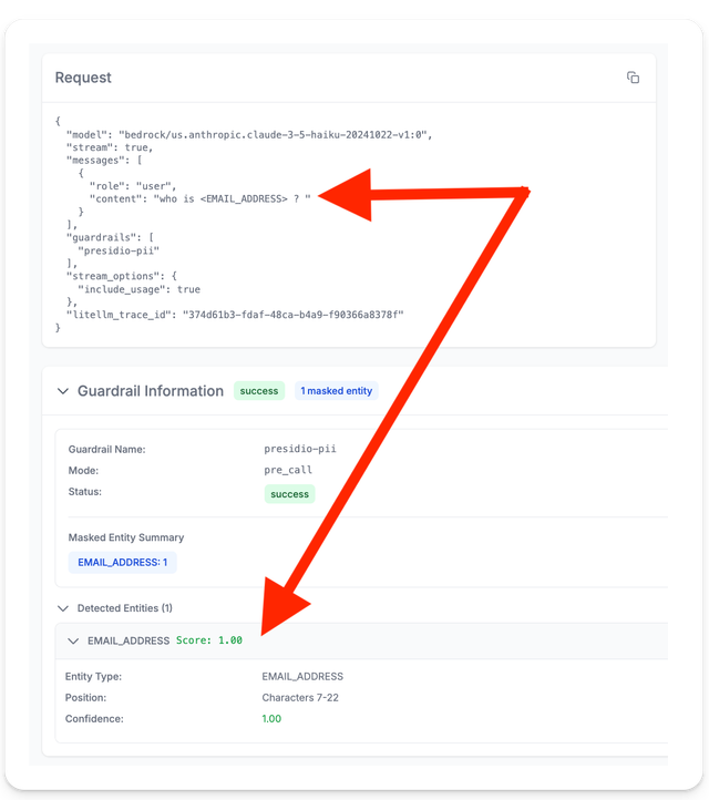 On the LiteLLM logs page you can see that the PII content was masked for this specific request. And you can see detailed tracing for the guardrail. This allows you to monitor entity types masked with their corresponding confidence score and the duration of the guardrail execution.