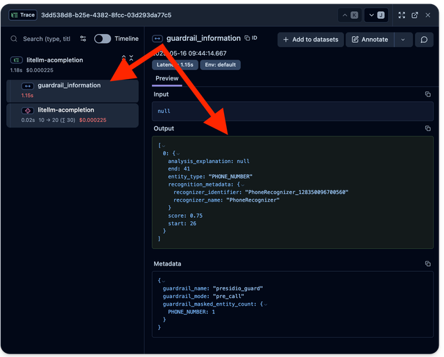 Once your guardrail is live in production, you will also be able to trace your guardrail on LiteLLM Logs, Langfuse, Arize Phoenix, etc, all LiteLLM logging integrations.